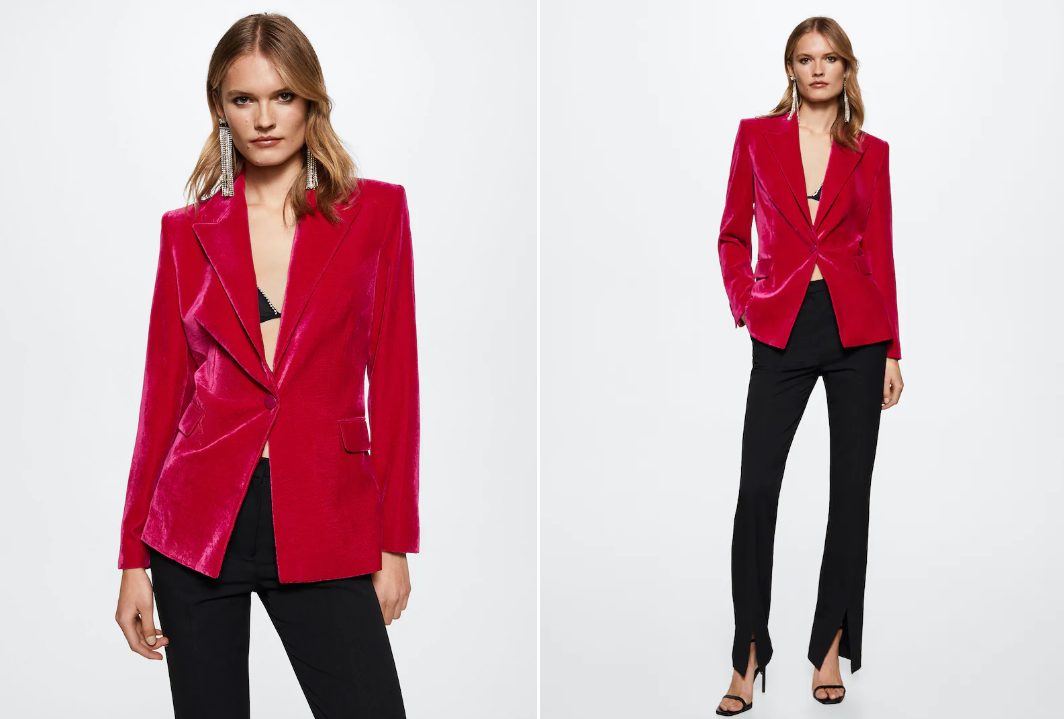 El tejido de terciopelo es uno de los más buscados cuando llegan las temporadas de otoño e invierno. Este es uno de los motivos por los que llama tanto la atención esta sofisticada americana de Mango. Con un color entre el rojo y el fucsia, además se convertirá en el centro de todas las miradas por 69,99 euros.