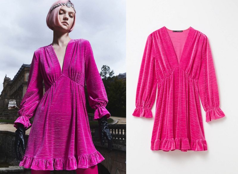 Sfera ha apostado esta temporada por el color fucsia como la opción ideal para dar un toque de color al otoño. Una de sus prendas en este color es este vestido mini terciopelo, que se encuentra ya a la venta en sus tiendas por un precio de 35,99 euros.
