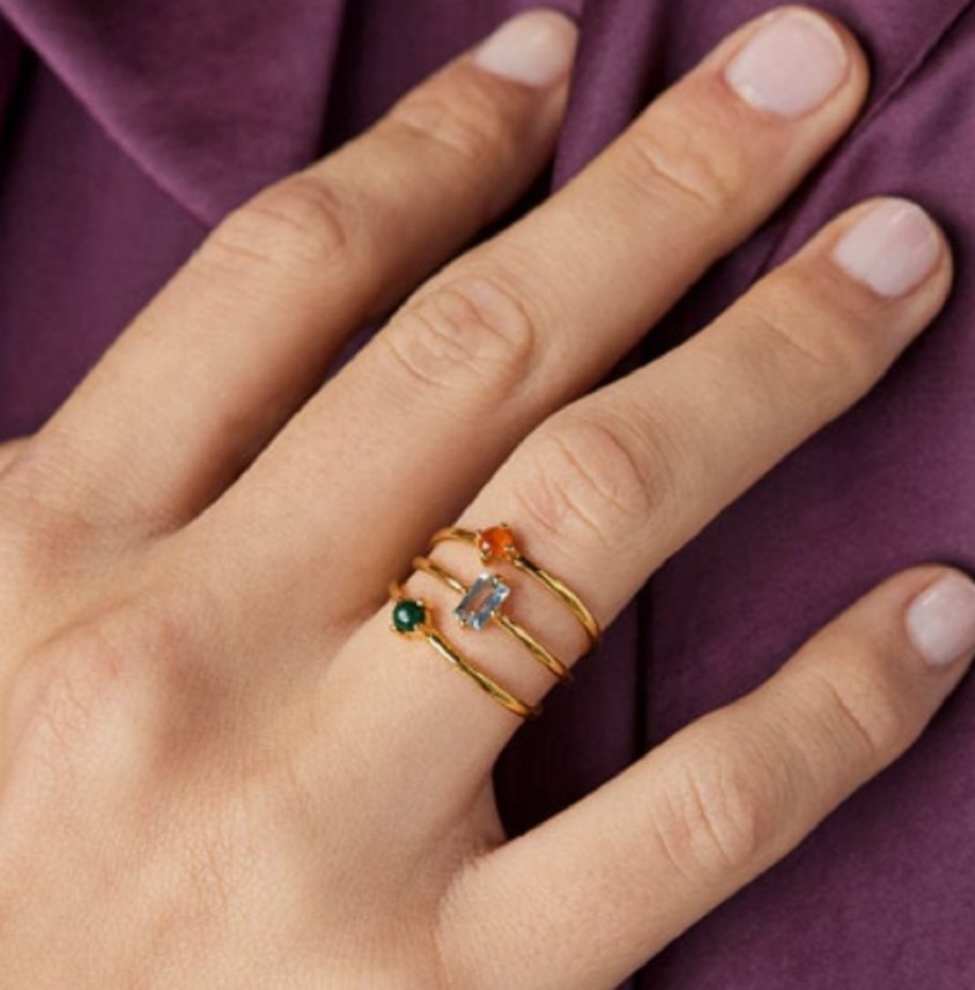 Puedes llevar uno, dos o tres. Juntos son una bomba y por separado quedan muy formales. Poseen el detalle de las piedras que es imposible que quede mal. Tienen una malaquita cabujón redondo de 3mm, topacio azul rectangular facetado baguette de 5x3mm y cornalita redonda faceta de 3mm. Hechos en plata de primera ley recubierta de oro de 18KT con un espesor de 3 a 5 micras y sin ningún otro metal entre ambos. La técnica con la que se ha logrado este exquisito resultado es la fundación. Su valor es 145 euros que se pueden pagar en tres cómodas cuotas de 48,33 euros.