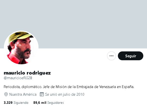 Sin embargo, también reconocen como un interlocutor a Mauricio Rodríguez, quien en su cuenta de Twitter se identifica como el Jefe de la Misión de la embajada de Venezuela en España, que según informan desde la embajada de Guaidó es el representante de negocios. Hace algunos días se dijo que había sido relevado en el cargo por Coromoto Godoy Calderón, quien había sido embajadora de Venezuela en Trinidad y Tobago, pero esta información no ha sido confirmada por ninguna autoridad venezolana.