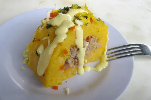 Seguidamente, repartimos este relleno por encima de la patata, sin llegar a los bordes, porque si no al enrollar sobresaldrá por fuera. Después, ayudándonos del papel film y con mucho cuidado vamos enrollando delicadamente hasta cerrar del todo el rollo. Envolvemos con el papel film apretando un poco y dejamos que enfríe un rato en la nevera para que todo tome consistencia y se amolden los ingredientes. Después de unos 30 minutos sacamos de la nevera y del papel film y colocamos en una fuente. Cubrimos con una capa de mayonesa, el huevo rayado y decoramos al gusto con rodajas de aceituna, cebollino o perejil picados, etc. Se sirve en rodajas y a disfrutar.