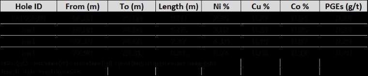 El pozo LAP22-19, perforado en la sección 16E, intersectó la zona de níquel a aproximadamente 60 metros en vertical por debajo de la superficie, donde permanece abierta en profundidad. La longitud indicada es la del núcleo; la anchura real no se ha determinado debido a la falta de información sobre la sección de perforación. Las nuevas interpretaciones preliminares sugieren que el plegamiento estructural (bisagras de plegado) puede controlar la localización de los brotes de níquel de alta ley engrosados, lo que puede ser el caso del pozo LAP22-19. El trabajo geológico continúa. Véase el comunicado de prensa anterior del 15 de septiembre de 2022 para la ubicación y los detalles del collar de perforación para el agujero LAP22-19.