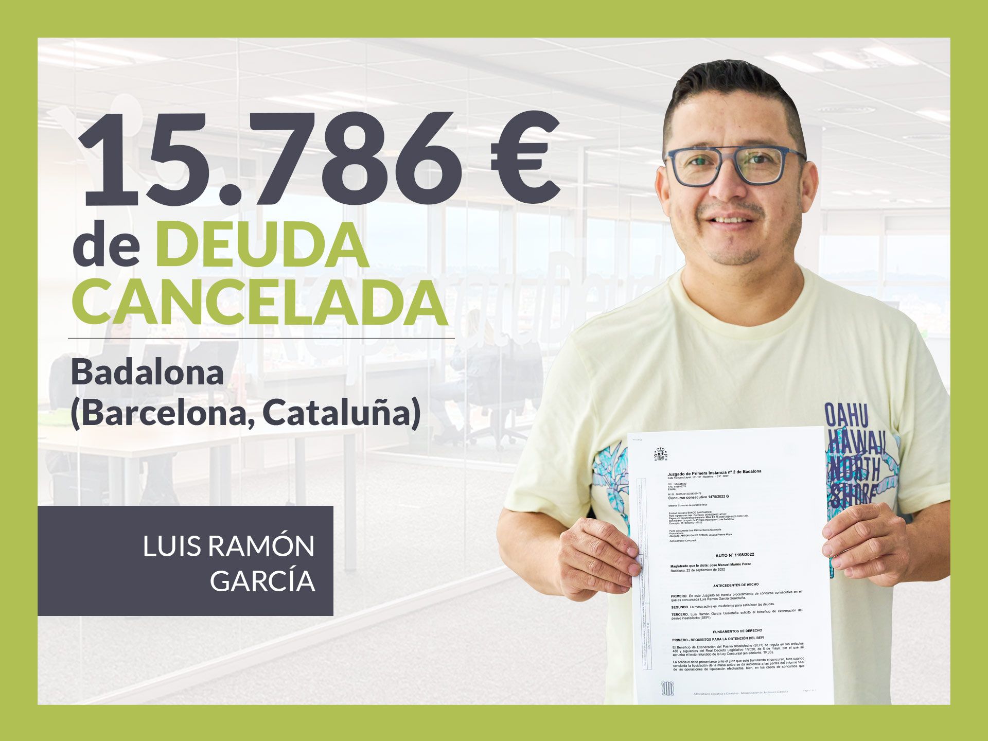 El Juzgado de Primera Instancia nº2 de Badalona (Barcelona) ha dictado Beneficio de Exoneración del Pasivo Insatisfecho (BEPI) en el caso de Luis Ramón García, quedando exonerado de una deuda de 15.786 euros. El caso lo ha tramitado Repara tu Deuda Abogados, despacho de abogados líder en España en la Ley de Segunda Oportunidad. VER SENTENCIA.