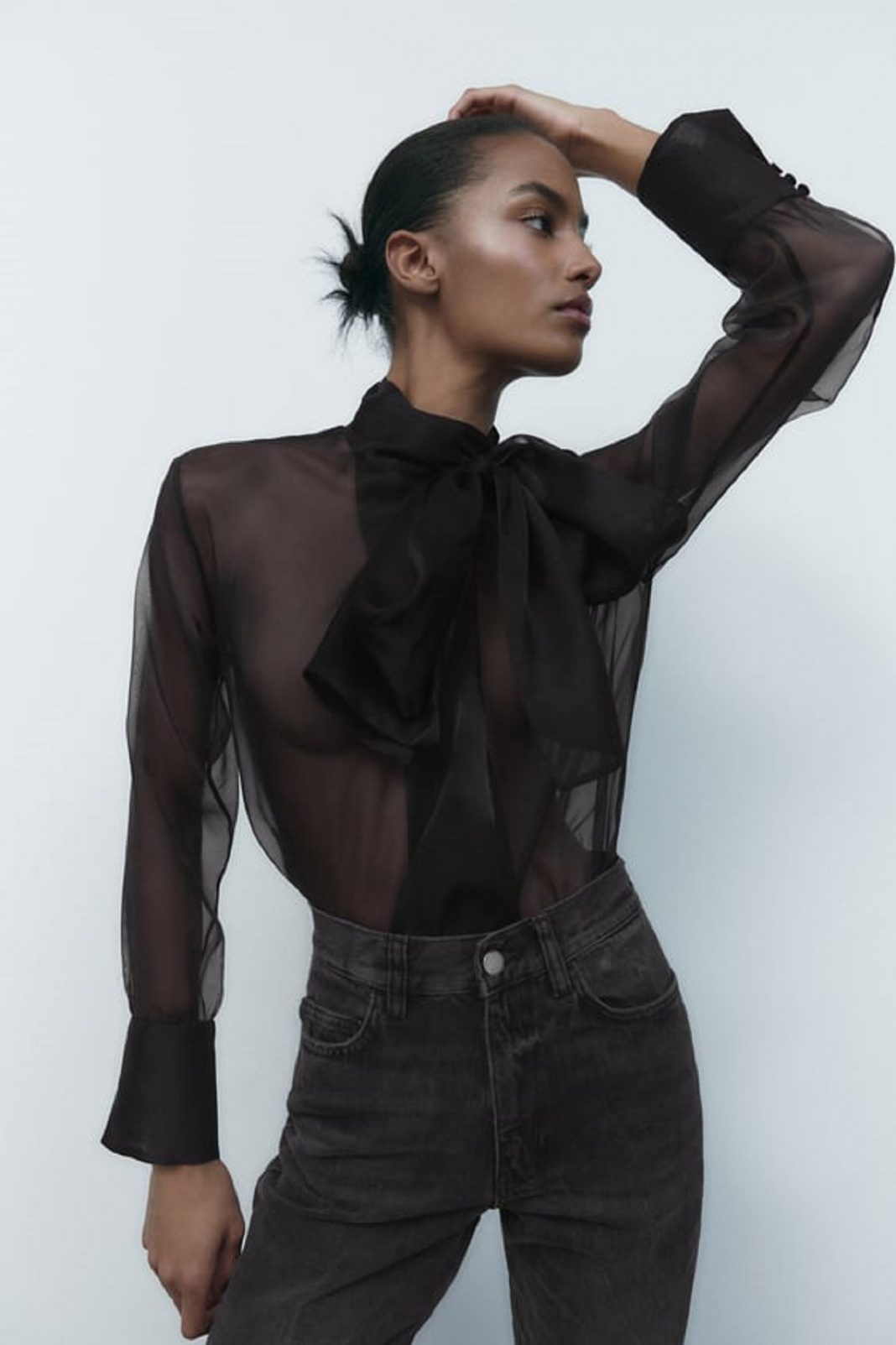 Esta maravillosa blusa semitransparente de cuello subido con lazo no puede gustarnos más. Su manga larga acabada en puño con botones forrados no puede realzar más la figura y el detalle de pinza que tiene en la espalda es colosal. No tiene forro interior, por lo que queda súper sexy. Algunas lo llevan con sujetador negro debajo para que se vea y otras directamente con pezoneras. Lo que está claro es que desapercibida no pasarás con este diseño. Su precio es 39,95 euros. Zara todavía tiene más prendas que te dejarán con la boca abierta.