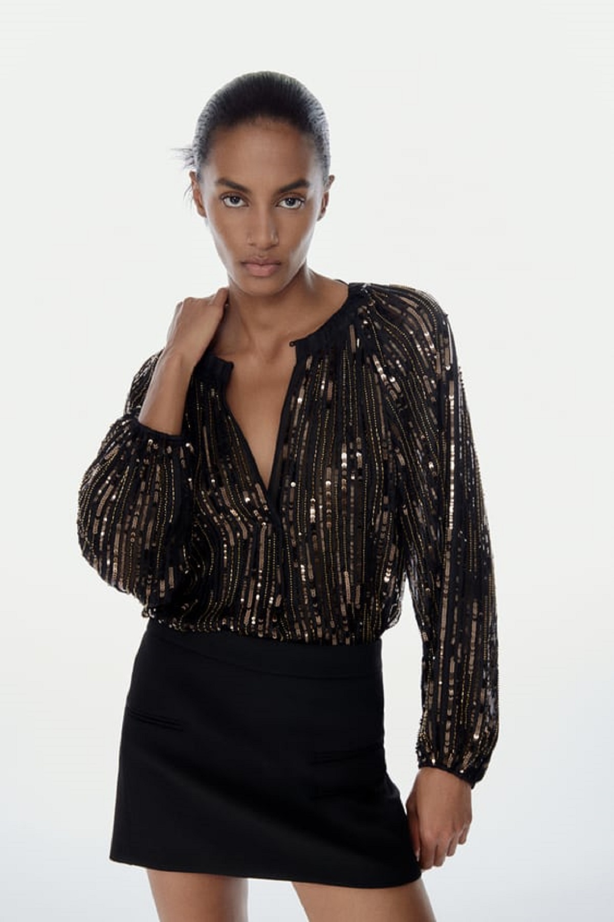 En plena moda de las prendas ‘overside’, Zara impone esta tendencia también en sus prendas más elegantes. Tiene dentro de su catálogo esta blusa de cuello redondo y escote pico con botón interior y manga larga abullonada acabada en puño elástico que nos tiene loquitas a todas. Su detalle de aplicación lentejuelas y abalorios combinados son el broche de oro para llevar a ese evento nocturno en el que quieres deslumbrar. ¿Qué tal Año Nuevo? Una época donde queremos estar perfectas y que nada se nos resista. Está a 59,95 euros.