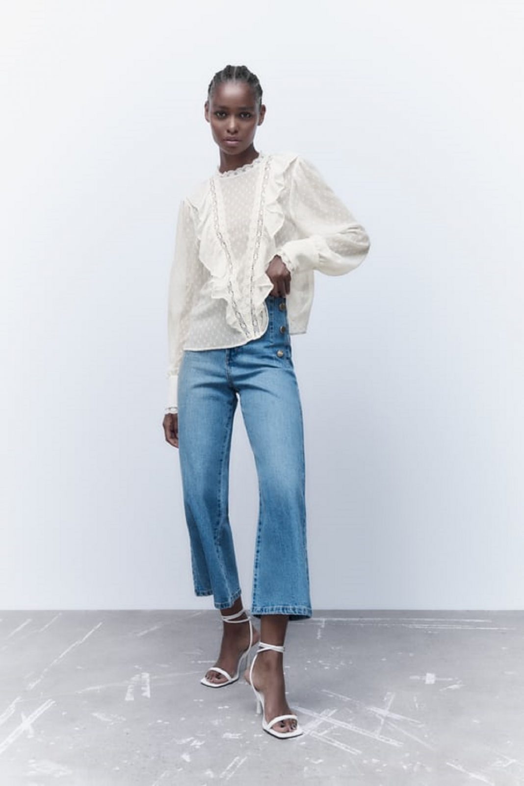 De nuevo estamos ante un modelo con transparencia, pero esta vez algo más recatado que el primero que hemos visto. Con el cuello subido y manga larga denota que para verano no es, pero sí para el resto de épocas. Hasta en invierno puedes lucirla estupendamente si cuando estás en exteriores llevas un abrigo acorde. Tiene un detalle de aplicación de encaje y volantes a tono. Para culminar un modelo perfecto, un cierre en espalda con abertura y botón. Esta es una de las piezas más económicas del estilo: 25,95 euros.