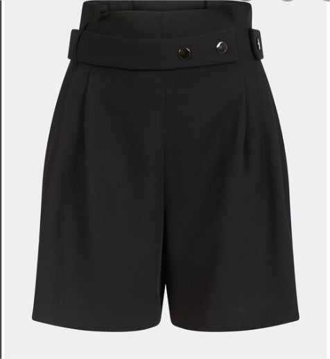 Bonito y práctico short de mujer de tiro alto con pinzas delanteras. Tiene cinturón del mismo tejido con detalles dorados. Está confeccionado en poliéster. Puedes combinarlo con un jersey estilo marinero con el cuello redondo, medias tupidas, y botas color vino tipo militar. Este short es una pieza ideal para tu fondo de armario.