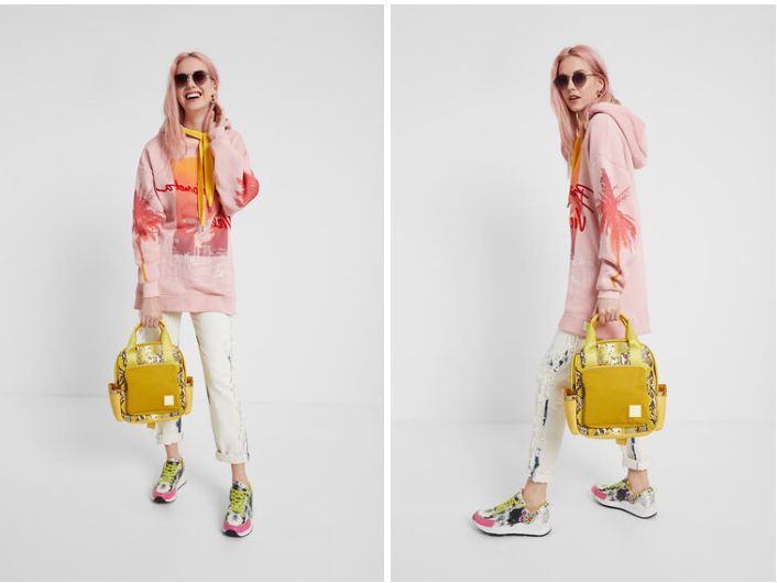 Como ves en la foto, y pasa con tantas prendas que ves nada más entrar en una tienda de Desigual, es irresistible. Más aún lo será con el descuento del 50% que tiene ahora, con lo que te sale por 49,97 euros. Es de estilo hawaiano en su esencia más cómoda, con cuello redondo, de manga larga y con capucha de grandes cordeles amarillos que contrastan con el rosa de la prenda y las palmeras en las mangas y el paisaje playero delantero. Una auténtica monada.