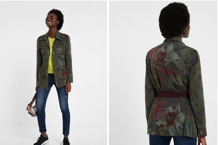 Veamos un estilo totalmente diferente en estilo, diseño y colores. Es una chaqueta militar camoflower, que vuelve a ser tendencia. Parece mentira como la «vuelta» que le da Desigual con el estilo y diseño la convierte en algo de lo más chic. También está a mitad de precio y se queda en 49,97 euros. Es se cuello camisero, cierre de botones de madera, cuatro bolsillos frontales e incluye cinturón con hebilla de carey y estampado también camoflower.