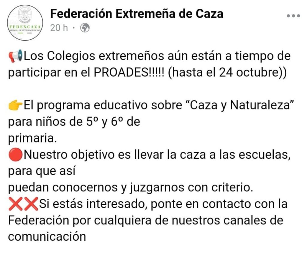Los cazadores de Extremadura quiere entrar en los colegios de esta región. La Federación Extremeña de caza se ha marcado el objetivo de enseñar a los menores lo que la actividad cinegética y por ello han puesto en marcha un programa que lleva por título ‘Caza y Naturaleza’, cuyo principal objetivo es llevar la caza a las escuelas. Es decir, quieren llevar a la caza a las escuelas y a todas las aulas de 5º y 6º de primaria de las región de Extremadura, con el fin, según destacan ellos mismos, de que puedan conocer las prácticas que llevan a cabo en profundidad y «juzgarnos con criterio». Lo que está claro es que este grupo pretende instruir a los más pequeños para vean la caza como algo positivo, para que conozcan la forma en la que matan animales con sus prácticas.