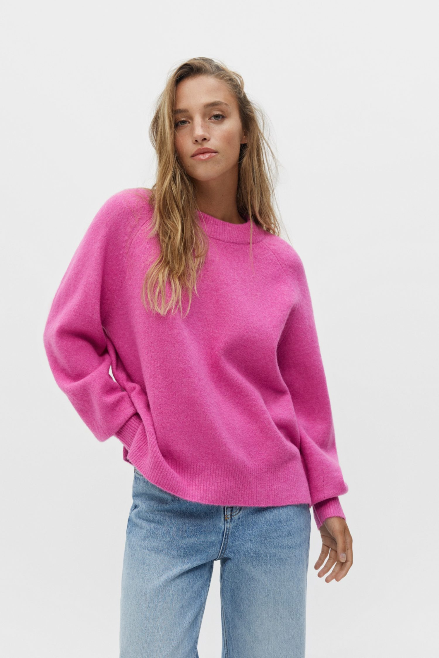 Pull&Bear tiene el jersey de punto cuello redondo que es el rey de los básicos para este año. Si eres de las personas que necesitan renovar todo su armario, esta prenda es perfecta para replicarla en todos los colores. Su tejido es súper suave y el detalle que tiene en los puños es ideal para salir de tu zona de ‘confort’. Hace que sea básico, pero no tanto. Pertenece a la gama de productos que tiene compasión con el medio ambiente. Por lo menos un 50% del artículo está hecho con poliéster reciclado y una menor cantidad de agua. Está en azul, fucsia, marrón, negro, arena y color camello. Su valor es 25,99 euros.