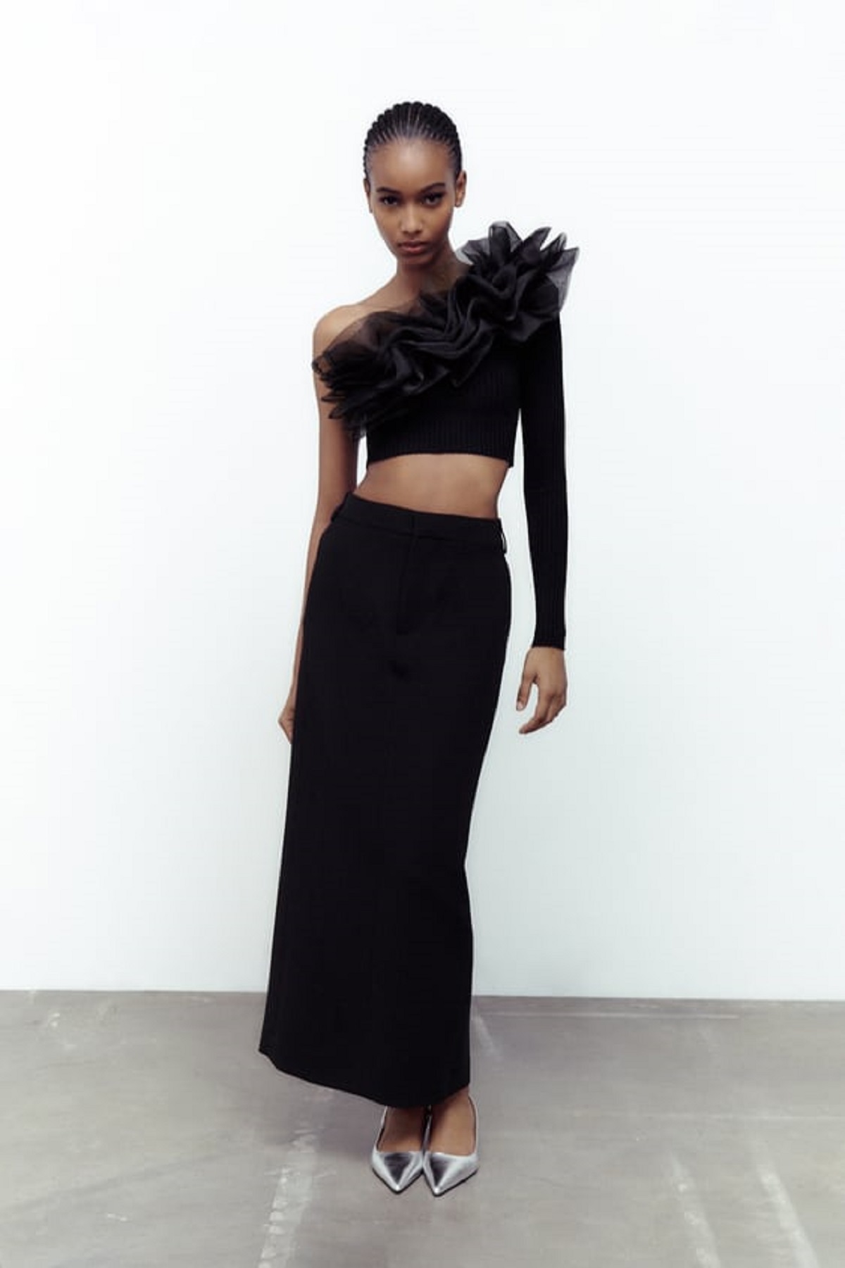 Es imposible pasar desapercibida con este top de Zara. Su escote asimétrico y manga larga lo convierten en la opción perfecta de cara a las fiestas. Llegar a esa cenita navideña con un abrigo y dejar a todos pasmados cuando te lo quitas. ¡Una sensación única! Su color negro es perfecto para llevarlo de noche en año nuevo o cualquier otra ocasión que se te presente. Cuesta 19,95 euros. Una prenda de estas características en una casa de moda de fiesta podría salirte el triple, pero la cadena de Inditex te lo pone fácil para que vayas guapa esta Navidad a precios económicos.
