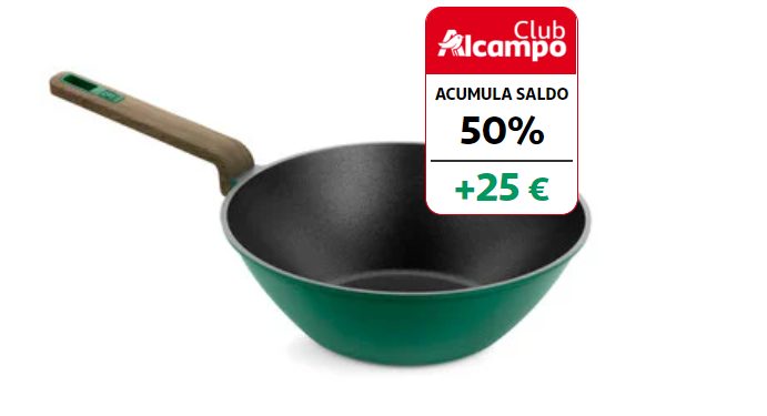 Esta sartén, ya disponible en Alcampo, se convertirá en la pieza más deseada de tu cocina. Con diseño de wok, es el utensilio perfecto para saltear verduras y darles un toque extra y distintivo con el que enamorarás a todos tus invitados. Además, ahora en el supermercado la puedes conseguir por 49,99 euros, pero se te acumulará el 50%, 25 euros, en tu tarjeta Club. Sin embargo, eso no es todo, sigue leyendo y descubre otros productos en oferta.