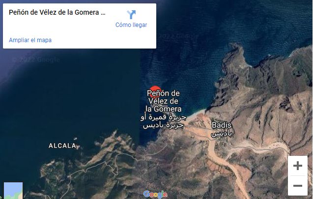 Situado a 126 kilómetros al oeste de Melilla y a 117 kilómetros al sureste de Ceuta, el peñón de Vélez de la Gomera limita con marruecos por una pequeña lengua de tierra formada tras un terremoto en 1930. Originalmente se trataba de una isla rocosa de 0,019 kilómetros cuadrados de superficie.