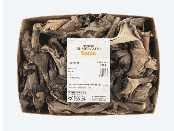 Bajo este nombre curioso se esconde ni más ni menos que una variedad de setas llamada Craterellus Cornucupioides. Es de origen búlgaro y es otra delicatesen culinaria al mejor precio, tan apetecible como la burguer estilo New York de Aldi con la que comenzamos. Tiene un 23% de descuento los 200 gramos y su precio se queda en 2,59 euros.