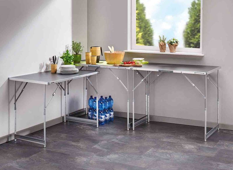 Con un armazón resistente de aluminio, son unas mesas aptas para muchos usos, siendo plegables para ahorrar espacio y facilitar su transporte. Se pueden usar juntas o por separado y disponen de una altura regulable en cuatro posiciones: 73-80-87-94 cm.