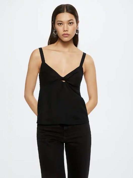 Si buscas un top que nunca falle y te lo puedas poner en cualquiera de tus eventos, tanto de noche como de día, este de Mango se convertirá en tu favorito. En este caso, hablamos de un top con nudo frontal, elaborada en lino y con el color negro que combina con todo. Además, ahora te puedes hacer con él por solo 12,99 euros cuando su precio anterior era de 19,99 euros.