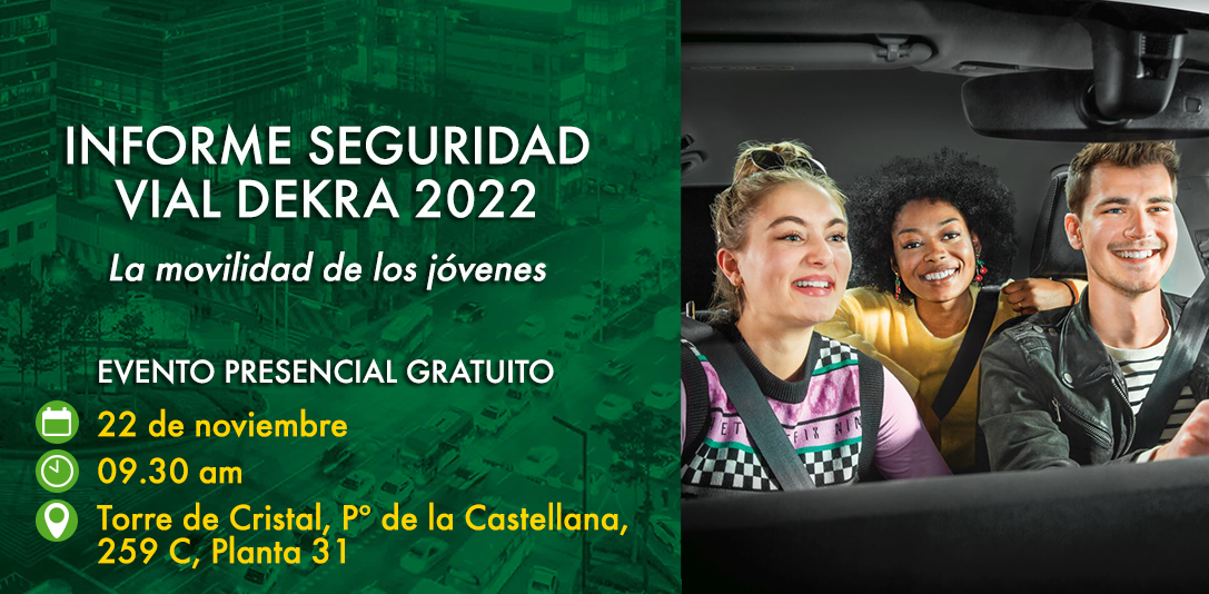 DEKRA España presentará por séptimo año consecutivo su Informe de Seguridad Vial DEKRA en Madrid el próximo 22 de noviembre. Este año, la temática del informe se centra en los jóvenes conductores de entre los 18 y 24 años. Este grupo de edad supone, junto a los mayores de 65 años y los motociclistas, un grupo de riesgo importante en el tráfico rodado