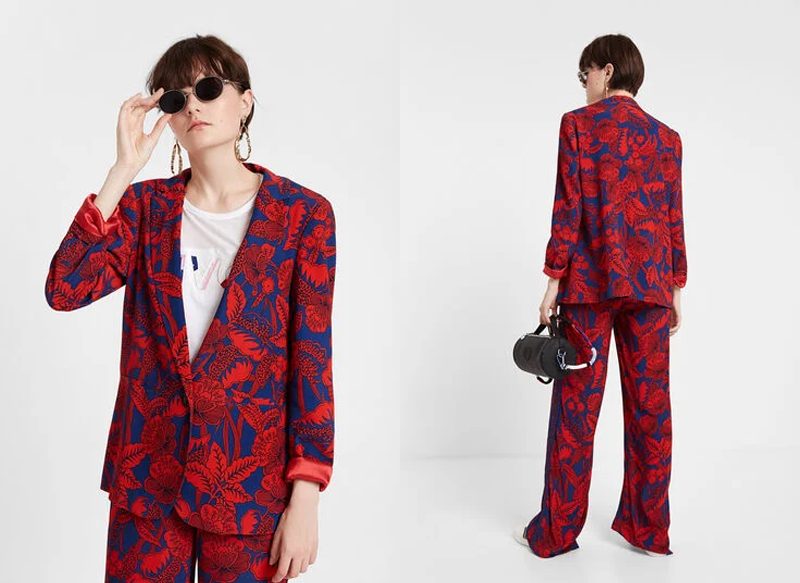 Otra de las chaquetas más populares de la firma española que está rebajada a mitad de precio es esta americana floral borgoña, que se puede comprar por 74,97 euros en lugar de por 149,95 euros.