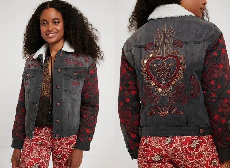 Es una chaqueta trucker bimateria oversize de tejido denim con mangas acolchadas con estampado floral y cenefas paisley con un gran corazón bordado en la espalda. Tiene cuello de borreguito crudo, con botones metalizados con molduras y un ajuste oversize. Se trata de una prenda perfecta para dar un toque original a tus looks, al mismo tiempo que disfrutas de una gran comodidad.