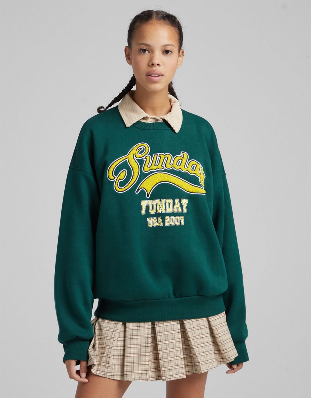 Las sudaderas se han convertido en una de las opciones más elegidas de cara a hacerle frente al frío. Esta, disponible en Bershka, cuenta con un marcado estilo college, un atractivo tono verde botella y print bordado de letras en amarillo, creando un llamativo contraste. Ahora, la puedes encontrar por solo 12,99 euros cuando su precio anterior era de 22,99. Una gran oportunidad.