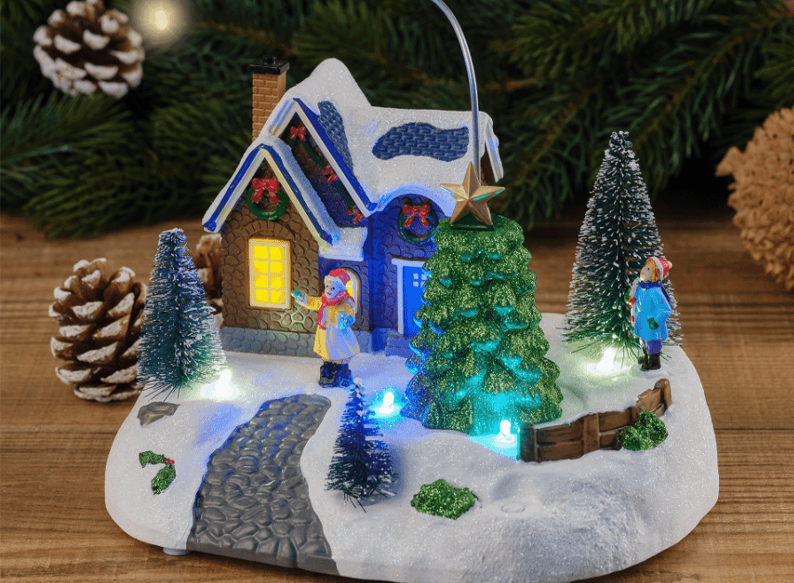 Con un tamaño aproximado de 19-24 x 15-19 cm, cuenta con 8 melodías navideñas y elementos giratorios, además de temporizador integrado. Está disponible en diferentes modelos y funciona con pilas (incluidas). Se pueden encontrar estos modelos por un precio de 19,99 euros la unidad.