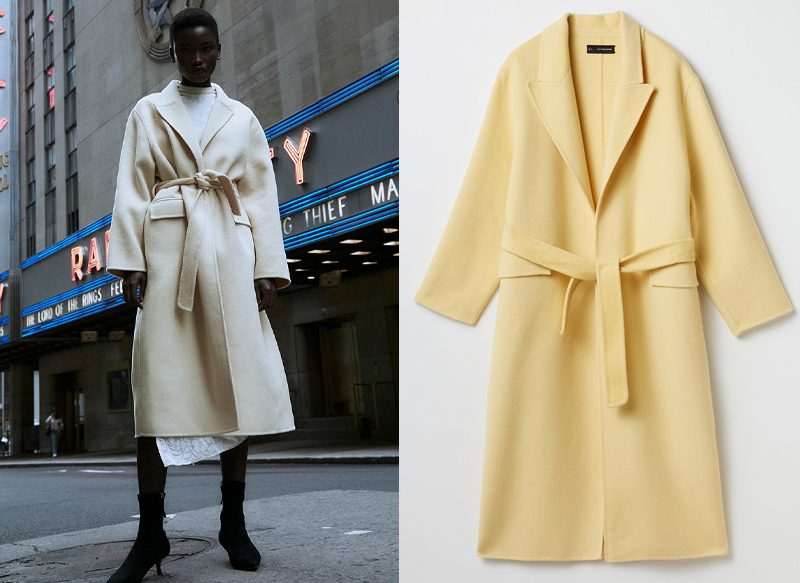 De color amarillo y a la venta por 89,99 euros, estamos ante un abrigo oversize con solapa y lazada a tono, que cuenta además con bolsillos delanteros con solapa. Está confeccionado en una mezcla de lana y otras fibras.