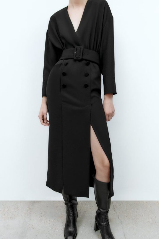Este vestido midi de color negro de Zara es uno de los más elegantes que encontrarás en su sección de precios especiales. Además, cuenta con detalles como el cinturón para hacer que tu figura se vea aún mejor. Si hablamos de su precio, ahora te puedes hacer con él por tan solo 25,99 euros cuando antes costaba 49,95. Sin duda, será tu mejor inversión.
