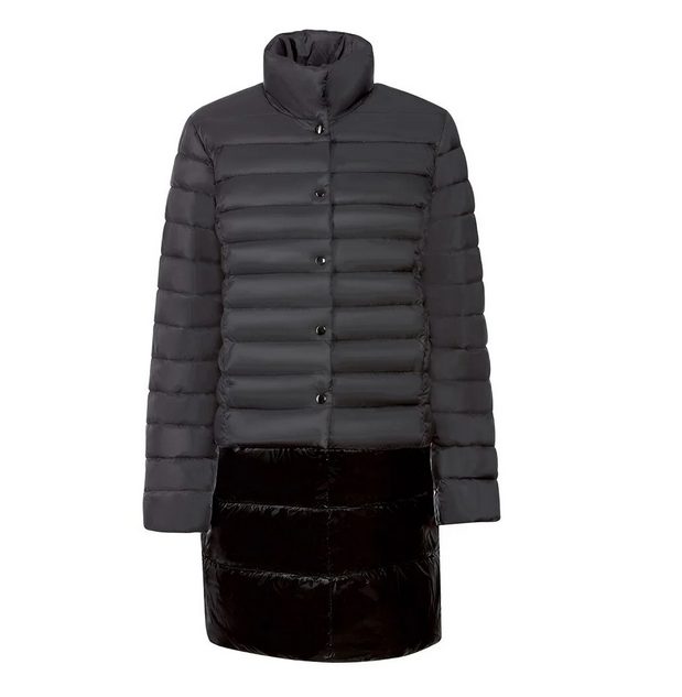 El corte es ligeramente entallado y la parte inferior con acabado de imitación de charol, es desmontable con una cremallera. Cierra con cremallera y botones, y está disponible en negro en tallas desde la XS hasta la L. El precio rebajado es de 15,99€.
