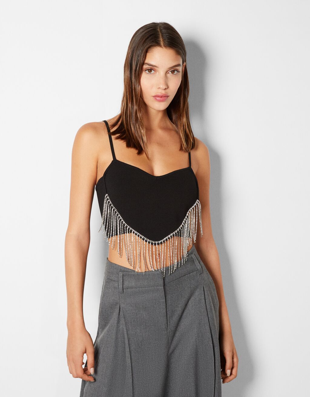 Si lo que estás buscando es un top capaz de atraer todas las miradas, en Bershka también tienen la prenda ideal para ti. Hablamos de este top con forma de corazón, de diseño corsé y color negro, que destaca gracias a detalles como sus flecos. En cuanto a su precio, puede ser tuyo ya por solo 29,99 euros.