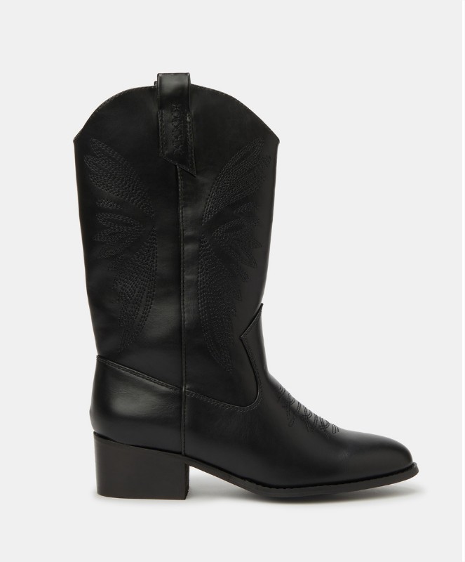 4Botas de mujer en negro tipo cowboy con bordados en la caña y tacón bloque