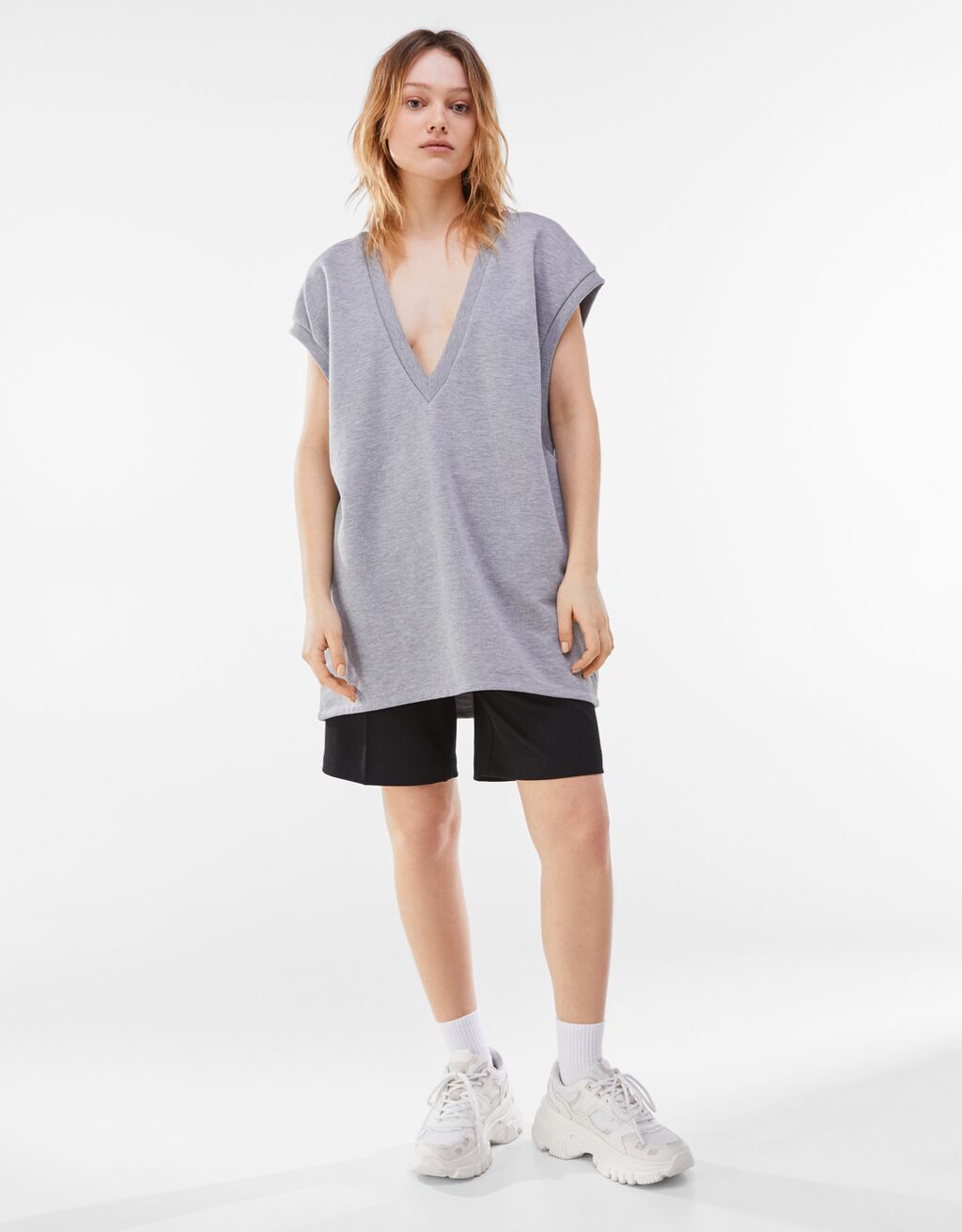 De nuevo, tenemos que destacar una de las prendas más cómodas que hemos encontrado en Bershka. Nos referimos a este chaleco, realizado en felpa, que también podemos usar como vestido debido a su longitud.