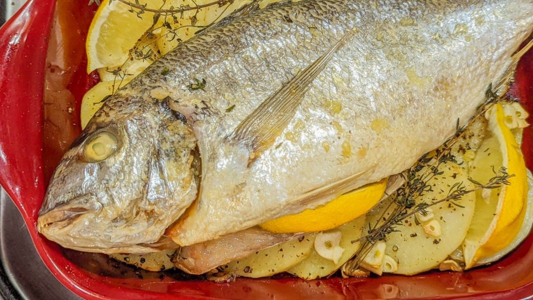 Por último, se pone la dorada encima. Un truco imprescindible de este plato pasa por coger un cuchillo bien afilado, hacer un par de cortes en el cuerpo del pescado y meter en él rodadas finas de limón. Así cogerá aún más sabor.