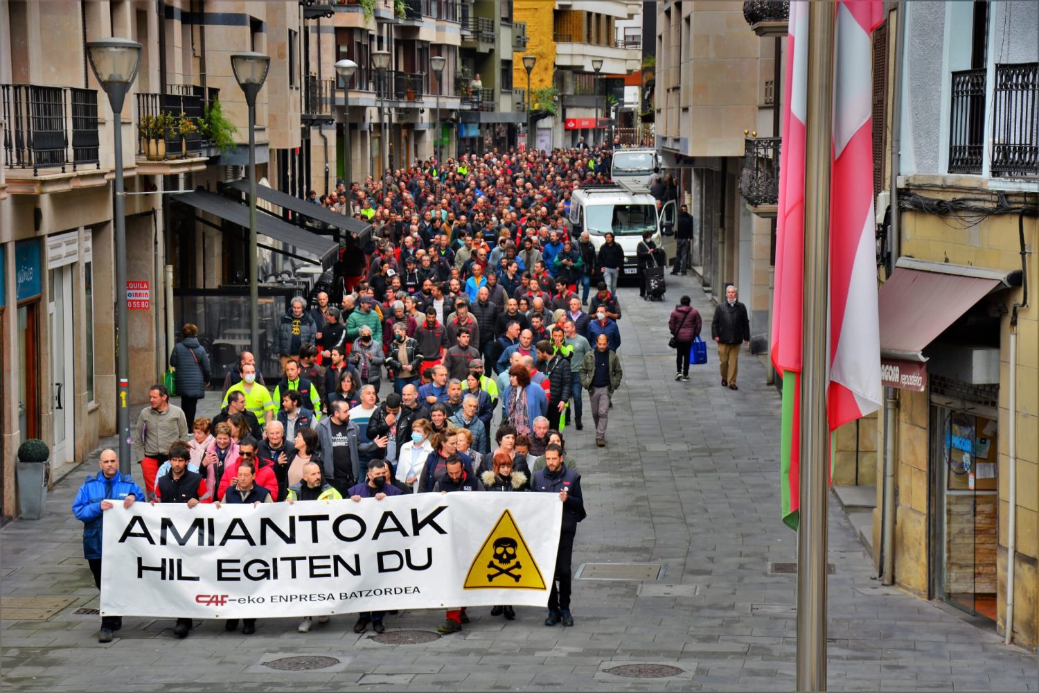 Pie de foto de portada: Trabajadores de CAF de Beasáin (Guipúzcoa) piden justicia y reparación por sus compañeros muertos y enfermos por el amianto | Asviame