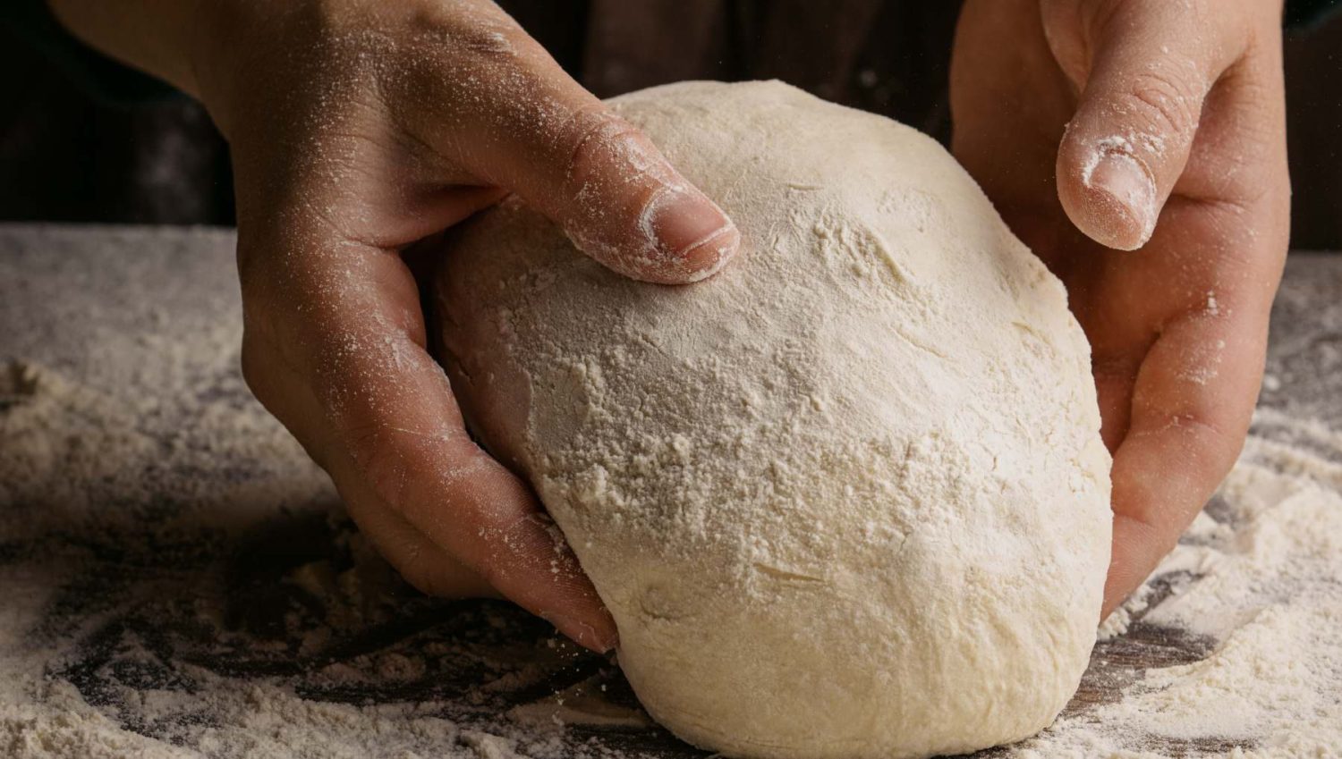 Y toca ya ejercitarse: volcamos en la encimera algo de harina y amasamos con las manos durante 10-15 minutos. La textura debe de quedar como para hacer una pizza o pan. Formamos una bola y la ponemos en un bol enharinado, tapando con un paño en un lugar templado durante una hora. Tiene que doblar su volumen.
