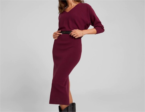 No te pierdas este magnífico vestido MIDI de punto en tono liso y color vino que ahora puedes conseguir con un descuento del 10% para decir divina en todo tipo de situaciones. Es ideal tanto para llevar al trabajo como para ir de shopping con tus amigas.