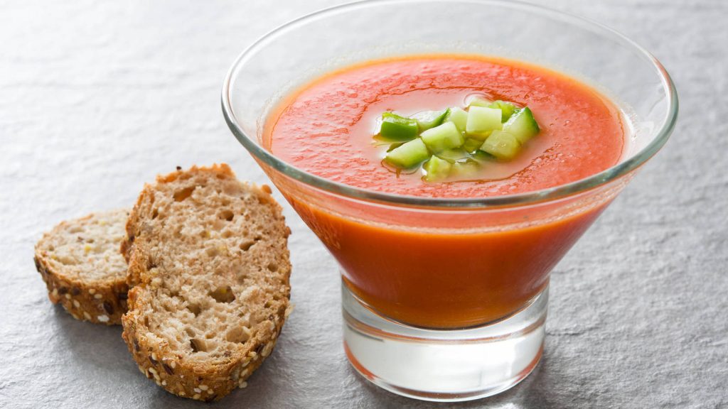 Éste no es más que una sopa fría compuesta por tomates, hortalizas, aceite y vinagre. Tal vez poco llamativo para los más pequeños, pero es que es una de las tapas diseñada para adultos. De hecho, en los bares lo sirven junto a rebanadas de pan, jamón y hasta huevos sancochados.