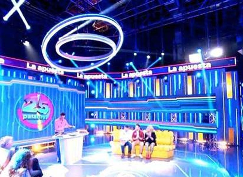 Mediaset ya ha mostrado en sus primeras imágenes el plató de 25 palabras, donde se puede ver en el centro la mesa del presentador y a cada uno de los lados un sofá amarillo para cada uno de los equipos. En la pantalla que estará detrás de Christian Gálvez, los espectadores podrán ver al concursante que participe desde casa.