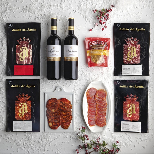 Hablamos de este lote, compuesto por un surtido de deliciosas piezas entre las que destacan, por ejemplo, el sobre de paleta de bellota ibérica o lomo, chorizo y salchichón de la casa Julián del Águila.