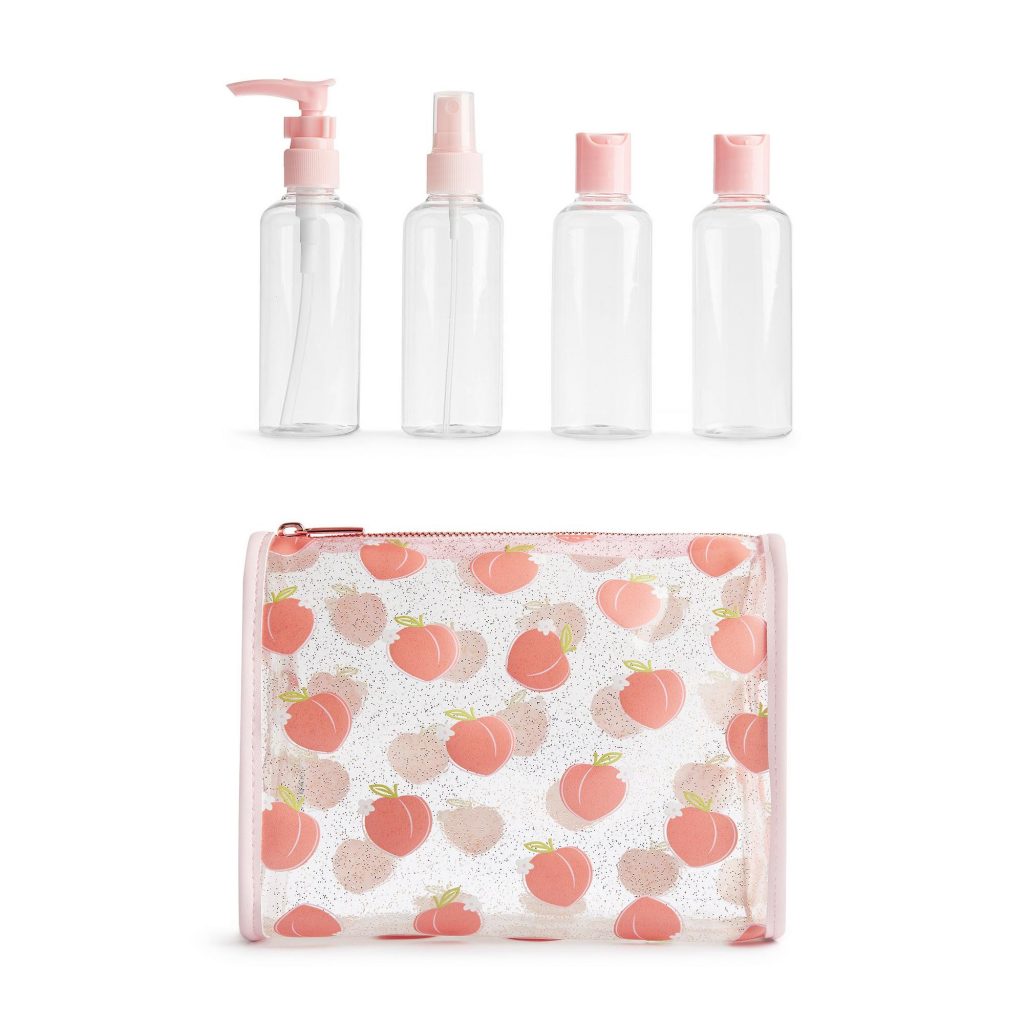 Hablamos de este producto, de la marca Peachy de SD Beauty, con un bonito estampado de melocotones, haciendo un guiño a la firma. Lo mejor, sin duda, es que en su interior nos espera una grata sorpresa. Podemos encontrar un total de cuatro botellas donde transportar líquidos, como gel o champú, con la capacidad perfecta para llevarlos en el avión.