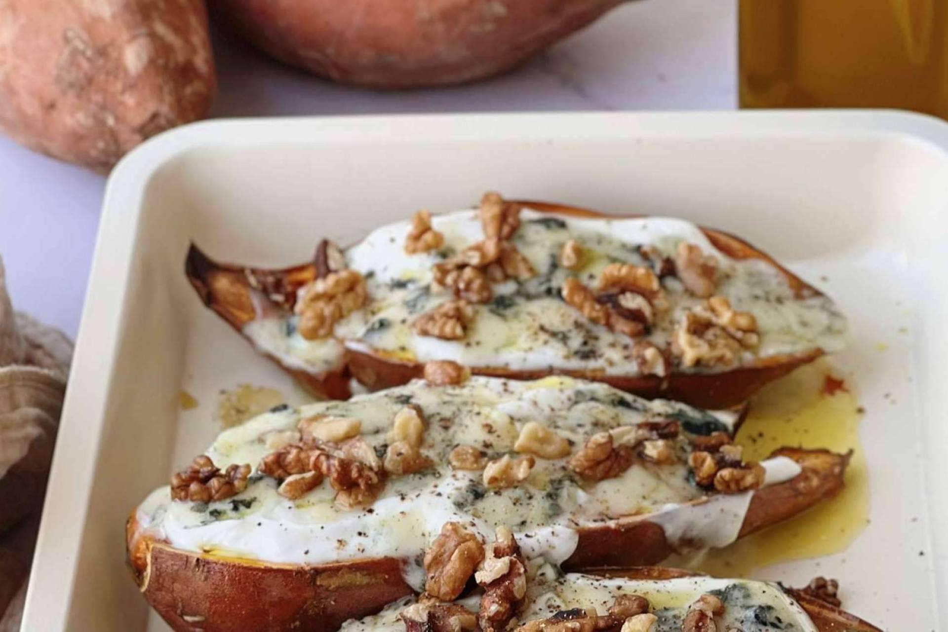 Una de las recetas más populares con boniatos se lleva a cabo utilizando queso roquefort, yogur griego, nueces troceadas y pimienta negra molida. Esta es una combinación muy sabrosa que les da un espacio para cualquier comida del día, lo cual demuestra que son un gran acompañante para otros platos, pero no significa que no pueden adaptarse para convertirse un plato fuerte en su esplendor.