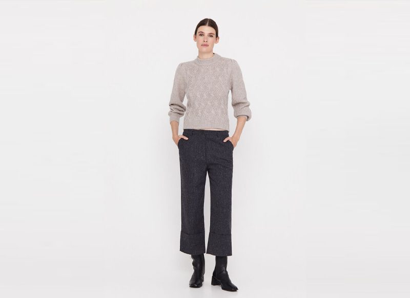 Es un pantalón crop con vuelta en el bajo que posee un cierre mediante cremallera oculta por tapeta y botón, así como trabillas para el cinturón. Está confeccionado en 100% algodón y tiene un precio de venta actual de 29,99 euros, permitiéndote de esta manera ir siempre a la moda y de acuerdo a las últimas tendencias de moda.