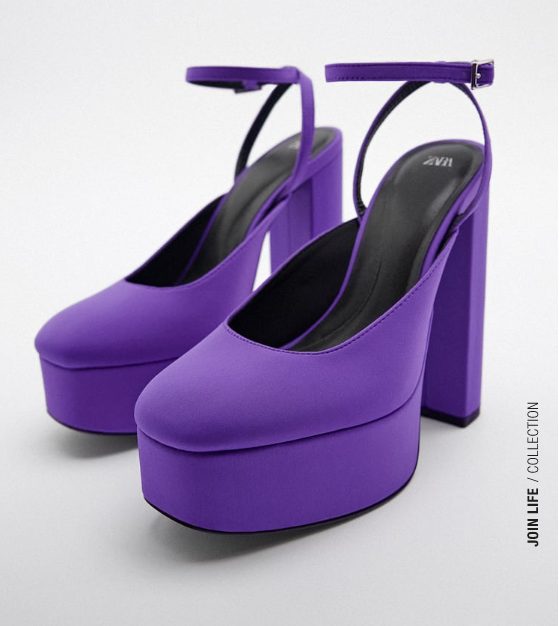 Otros de los tacones de Zara más llamativos para estas fiestas son estas plataformas. De gran tamaño y un imponente color morado, se convertirán en tus preferidas si deseas darle el protagonismo por completo a tu calzado. Cómodos y llamativos, están disponibles además por tan solo 35,95 euros. No los querrás dejar pasar.