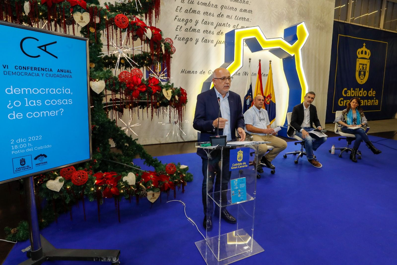 El Cabildo de Gran Canaria, a través de la Dirección de Participación Ciudadana, organizó un año más la Conferencia Anual de Democracia y Ciudadanía, un evento consolidado en la agenda de actos sobre política y democracia en las islas, y que cumple su sexta edición. Este año llevó por título Democracia, ¿o las cosas del comer?, donde se analizó la democracia actual, la desafección política y si realmente la democracia está solucionando los problemas del común de la ciudadanía.