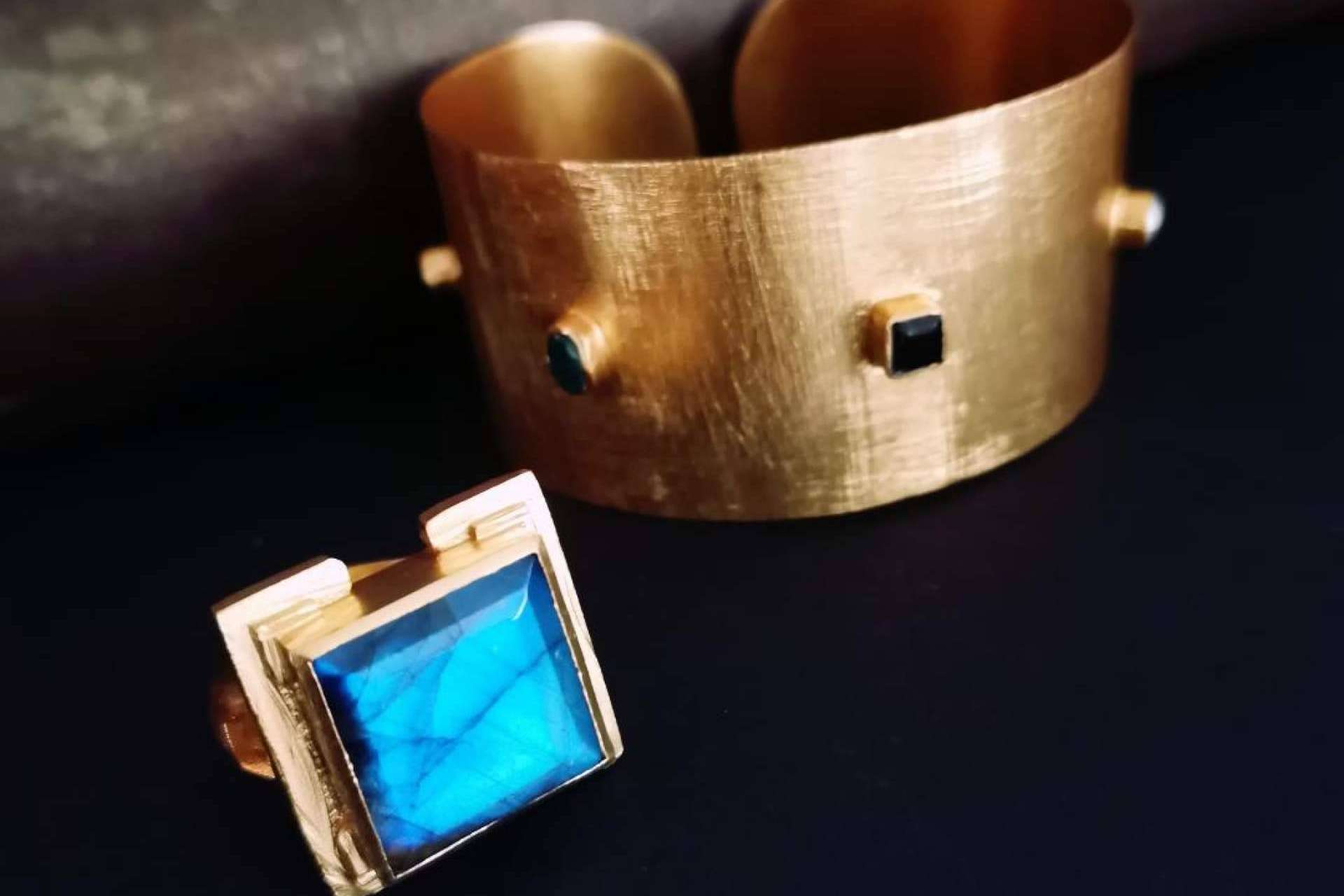 Todas las joyas que elaboran son trabajadas una a una a base de bronce y piedras semipreciosas, delicadamente cortadas y chapadas con oro de 2 micras de grosor. Para asegurar la larga duración de la joya, utilizan revestido con tecnología e-coting, una pátina que se aplica sobre el chapado y que sella la gema.
