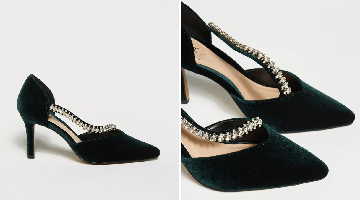 Estos tacones de Sfera destacan gracias a varios detalles que los hacen únicos y especiales. En primer lugar, su acabado de terciopelo en color verde oscuro hará que combinen con todos tus looks. Por otro lado, llama la atención también su tira de strass, que atrapa todas las miradas. Asimismo, los puedes conseguir por solo 32,99 euros. No querrás dejarlos pasar.