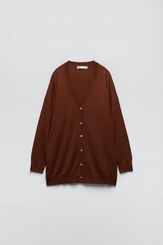 La chaqueta tipo cárdigan de punto es un must atemporal que no puede faltar en ningún armario. Es ideal para completar looks casuales y conseguir un aire de oficina confortable y clásico. Además, siempre sienta bien y se puede combinar prácticamente con cualquier prenda. Este modelo de Zara es de corte largo, con escote de pico y manga larga. Los acabados son en rib y cierra con botones combinados a tono. Está hecha en una mezcla de materiales sintéticos con un 5% de lana para una mayor calidez. Tiene un descuento del 42% y ahora cuesta 15,99€.