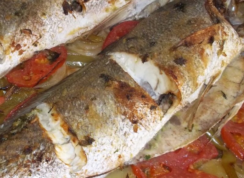 Ahora es el momento de colocar la corvina encima de la bandeja y echar por encima el aliño restante, además de un poco por su interior. Introduce ahora la bandeja en el horno a una altura media y mantenlo en su interior para que se cocine durante 30-35 minutos aproximadamente. Si se evapora todo el líquido puedes agregar un poco más de vino blanco.