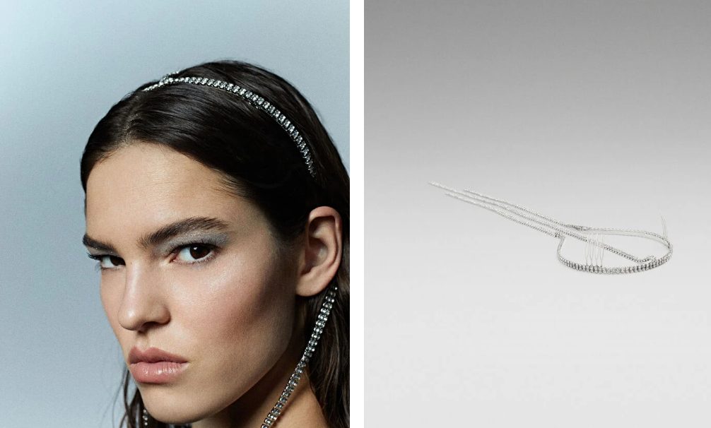 Vamos por algo original, hablando de no pasar desapercibida. Parfois tiene esta diadema de colgantes strass en composición 40% de latón, 30% de hierro y otro 30% de vidrio. Es una forma de lo más chic y original de despedir el año, con ese toque de modernidad incluso futurista pero no exenta de sencillez. Lo tiene todo para lucir algo nuevo diferente, porque su precio es también irresistible: 25,99 euros.