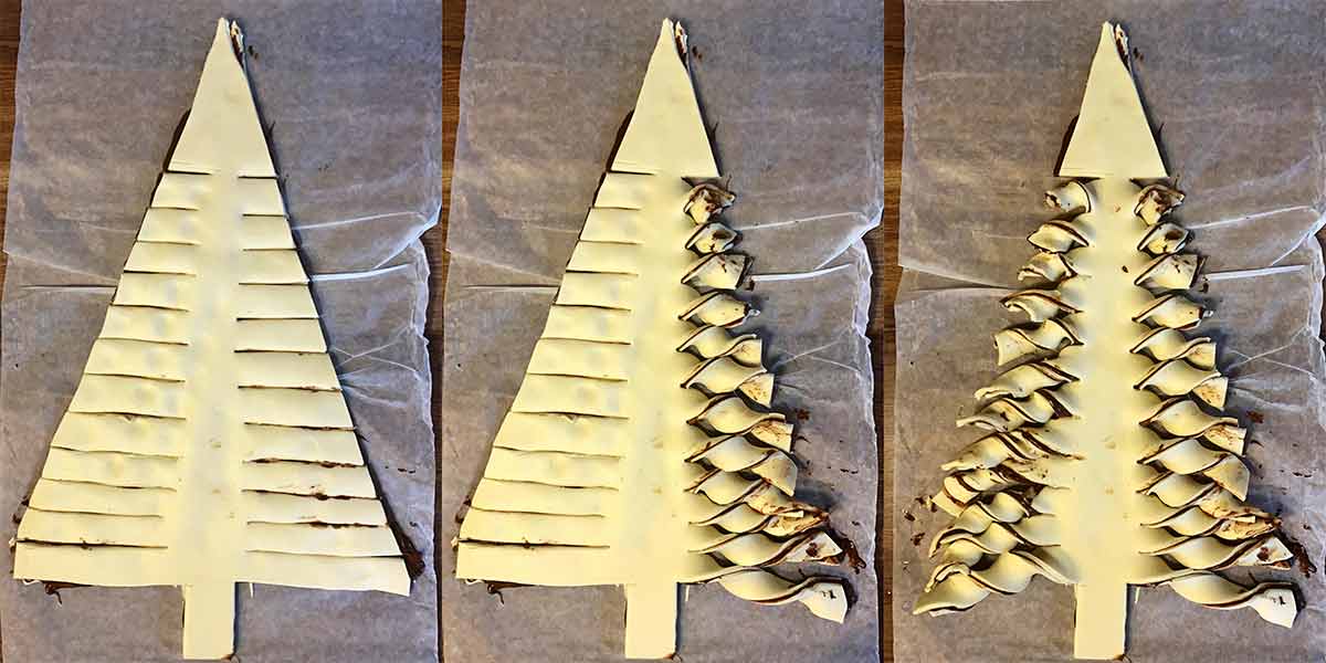 El siguiente paso es realizar cortes laterales en ambos lados del abeto pero sin llegar hasta el centro. Este espacio central representa el tronco del árbol y los cortes laterales harán las veces de ramas. Después, retocemos estas tiras de los lados sobre sí mismas, en forma de tirabuzón. Según su longitud admitirán más o menos vueltas. Después batimos el huevo y lo aplicamos con un pincel por toda la superficie para que al hornearlo tenga un bonito color. Hay que hacerlo con mucho cuidado para que no se salga el relleno y no manche el hojaldre. Tomamos una de las estrellas que hemos recortado y la adherimos a la parte superior agregando un poco de huevo para que se pegue bien.